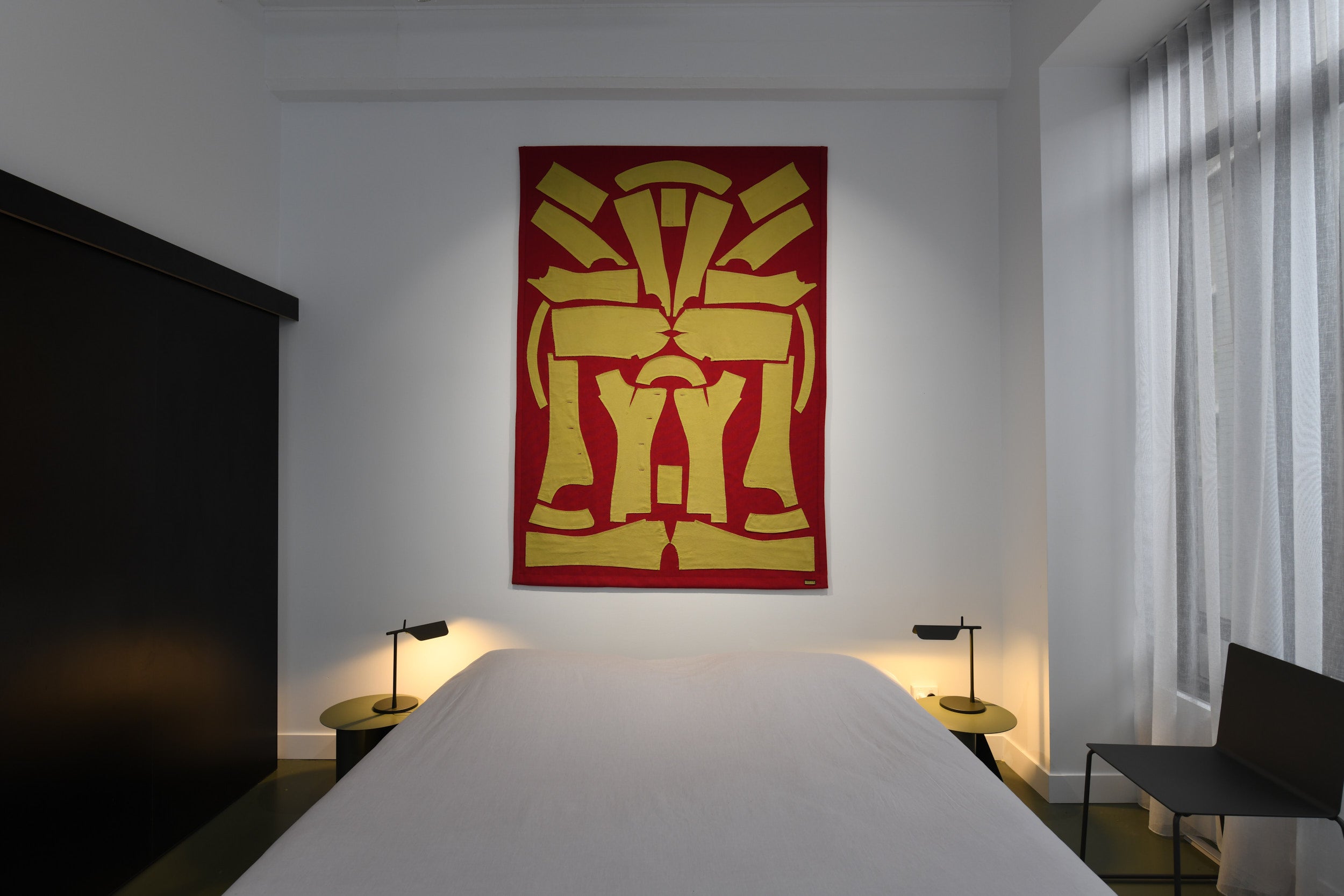 Dress-un-making. Existing garments taken apart, seams carefully unpicked. Fabric pieces rearranged to form patterns. Undoing someone’s past work could feel destructive, but instead feels celebratory as unexpected shapes emerge and new objects form. The objects find their place in the apartment, on a wall, on the bed. They immediately feel at home here, maybe they sense that this place understands where they come from.