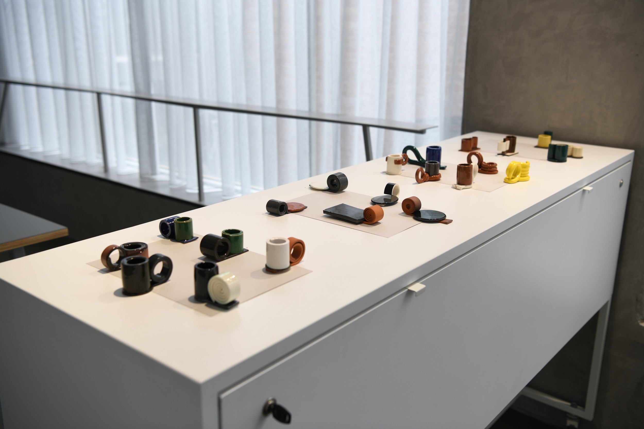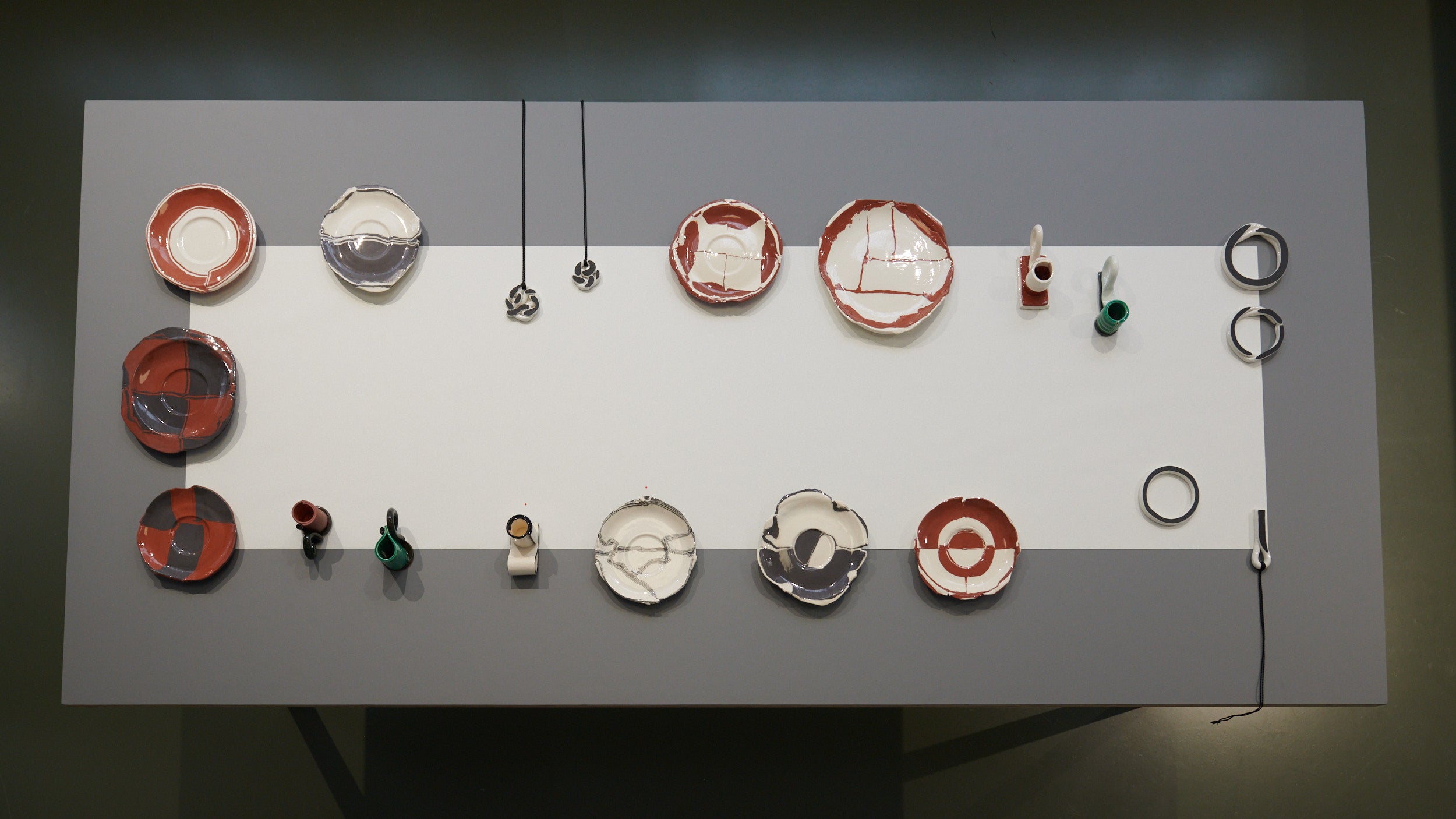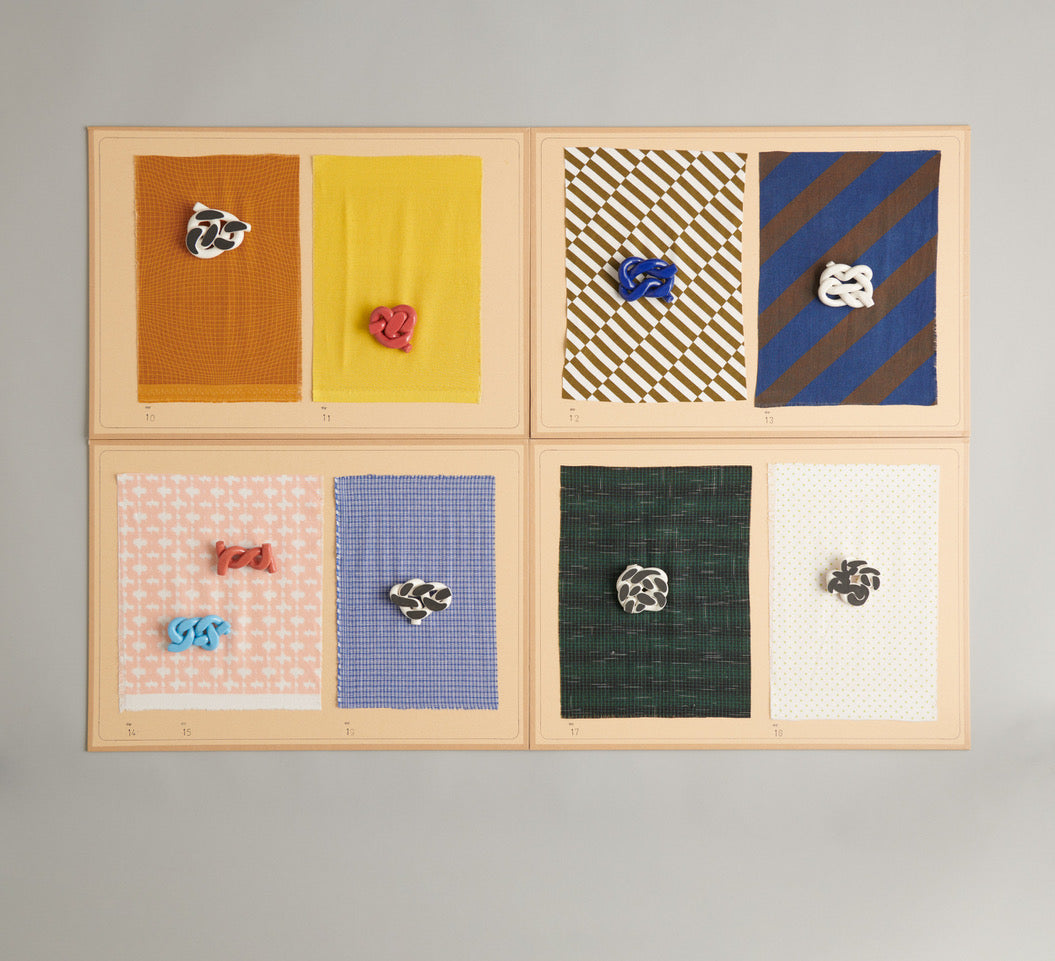 Clay-tailoring. Plates and candlesticks, brooches, bracelets and pendants constructed from earthenware and porcelain clay. Rolling, layering, twisting, knotting, pressing; here patterns are revealed by the making process. Things gather in the living room and around the dining table. Although they might seem quite different they get along well.